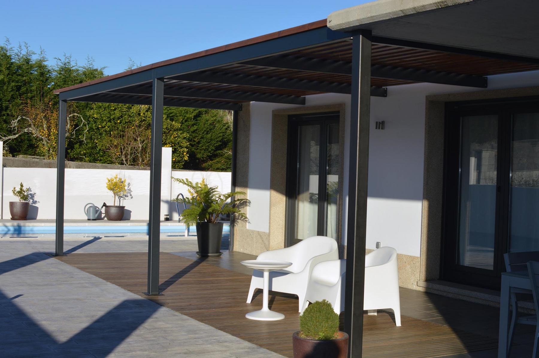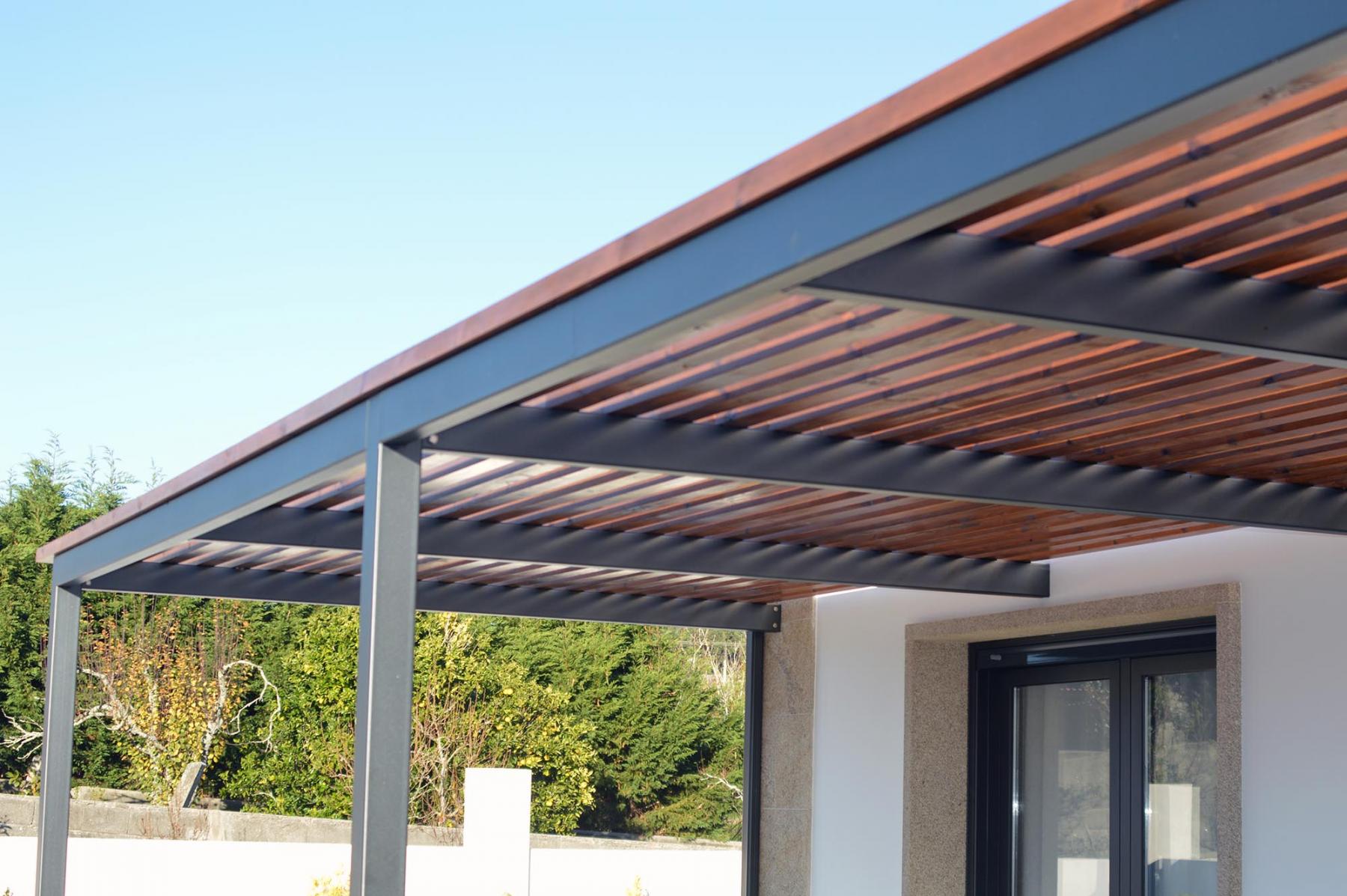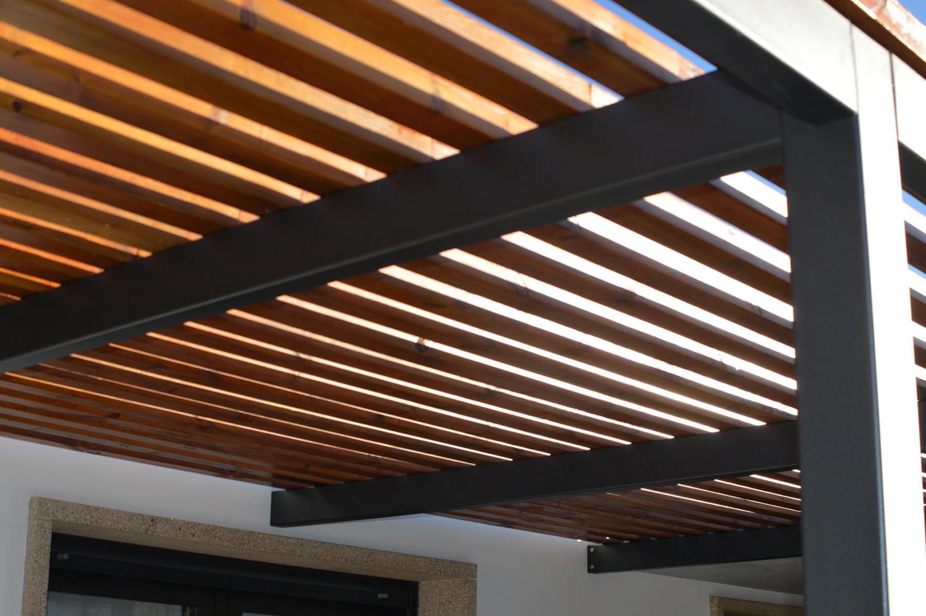 Estructura para pérgola en acero galvanizado por inmersión y lacado. Parte superior en listones de madera.
