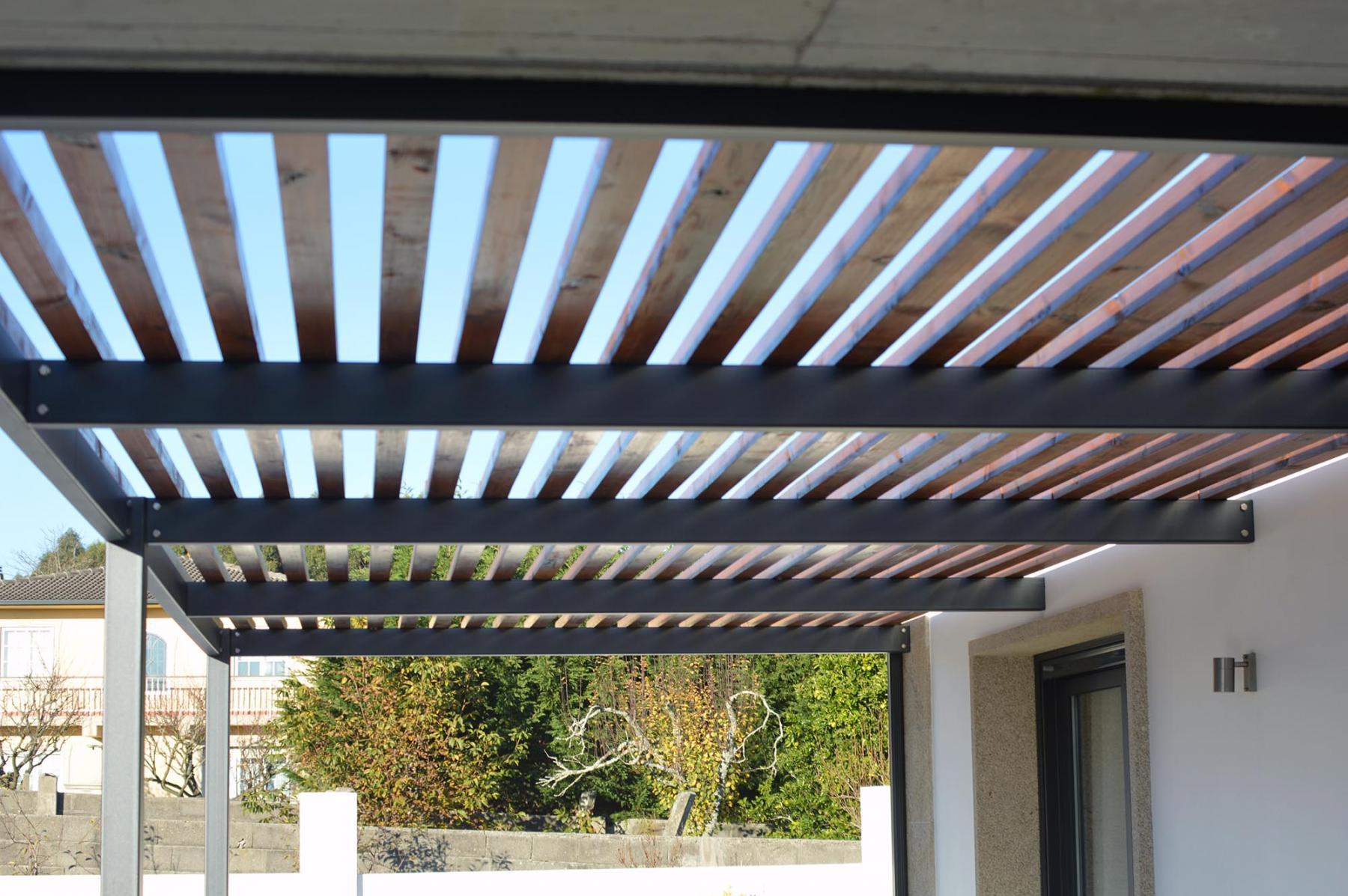Estructura para pérgola en acero galvanizado por inmersión y lacado. Parte superior en listones de madera.